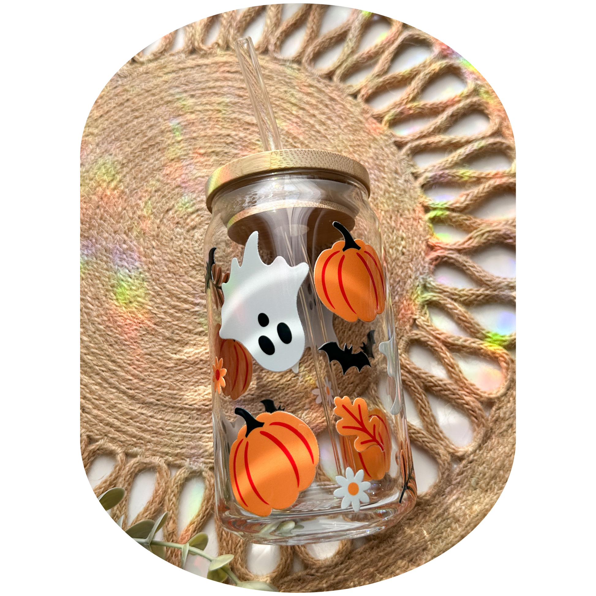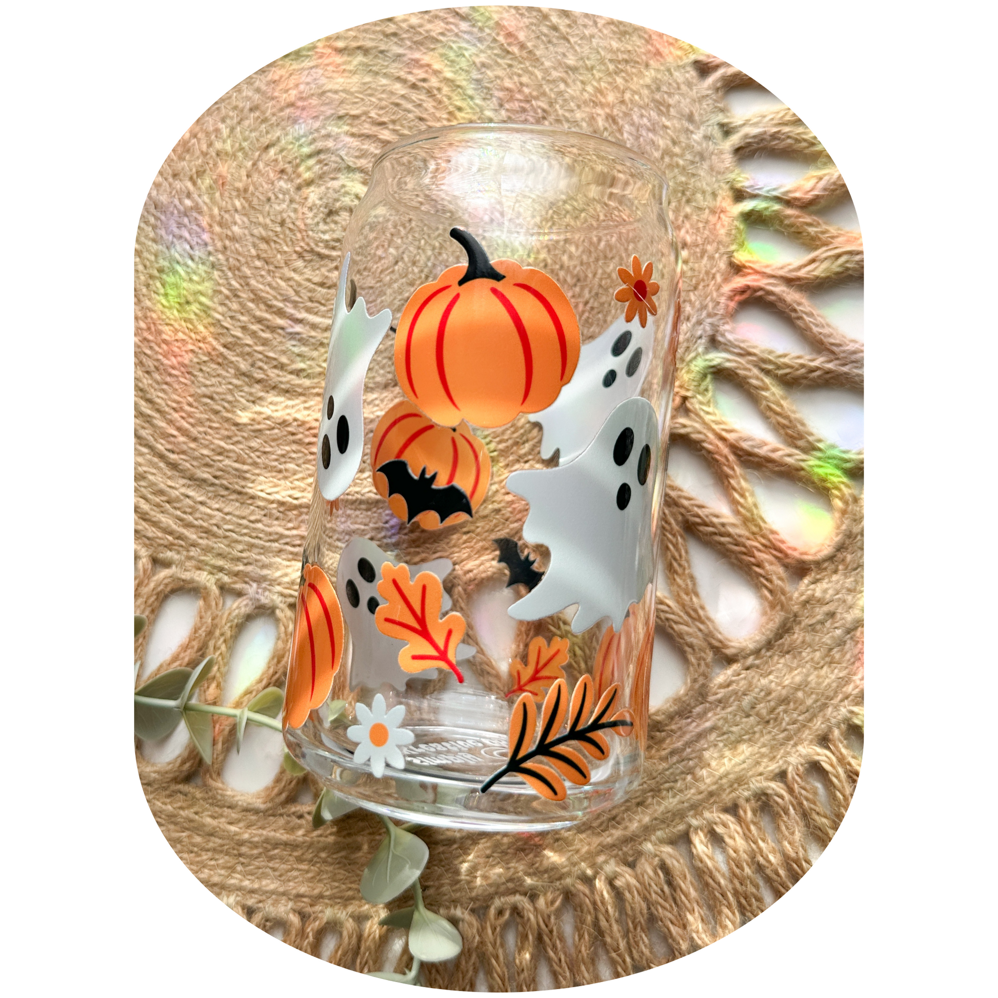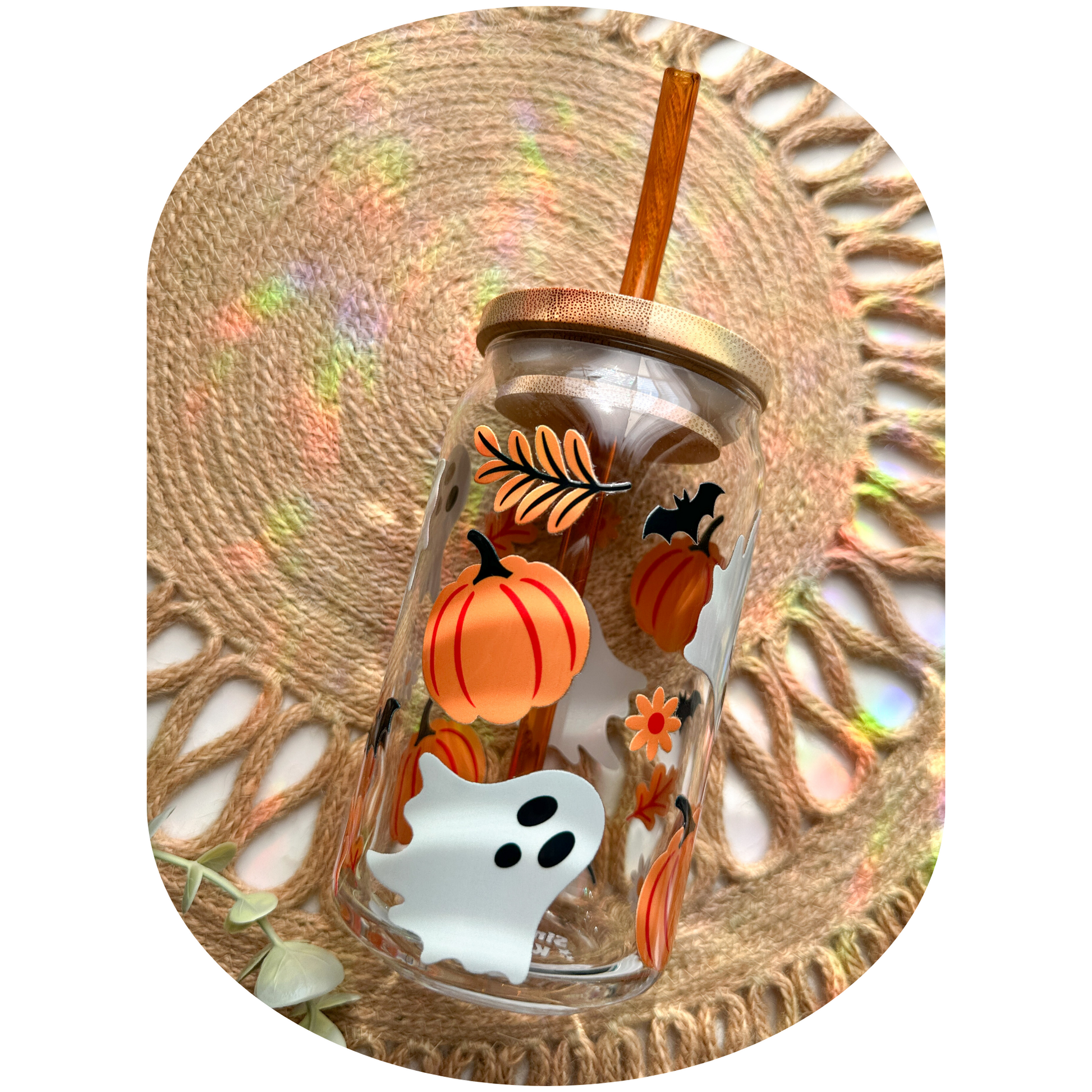 Bring a little spooky charm to your sips! This glass can features playful pumpkins, a friendly ghost, and cozy autumn details—perfect for iced coffee, tea, or your favorite fall drink. The double-sided UV DTF design means you’ll enjoy the festive artwork from the outside and see it through the inside too.