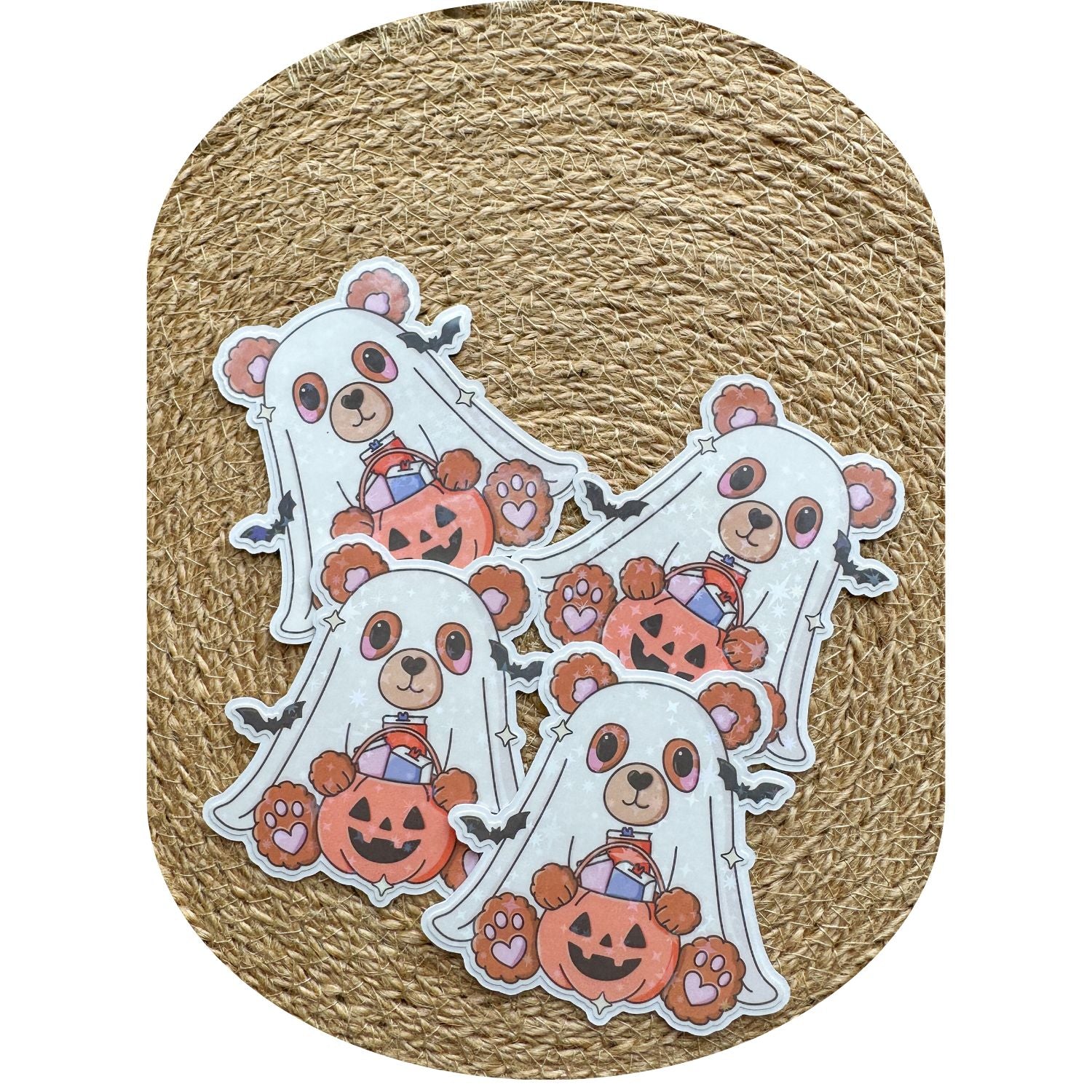 This adorable teddy bear dressed as a little ghost is ready for trick-or-treating with a pumpkin pail in hand! Printed at home and sealed with a protective self-laminated sheet for extra durability, this sticker is perfect for laptops, water bottles, or planners.