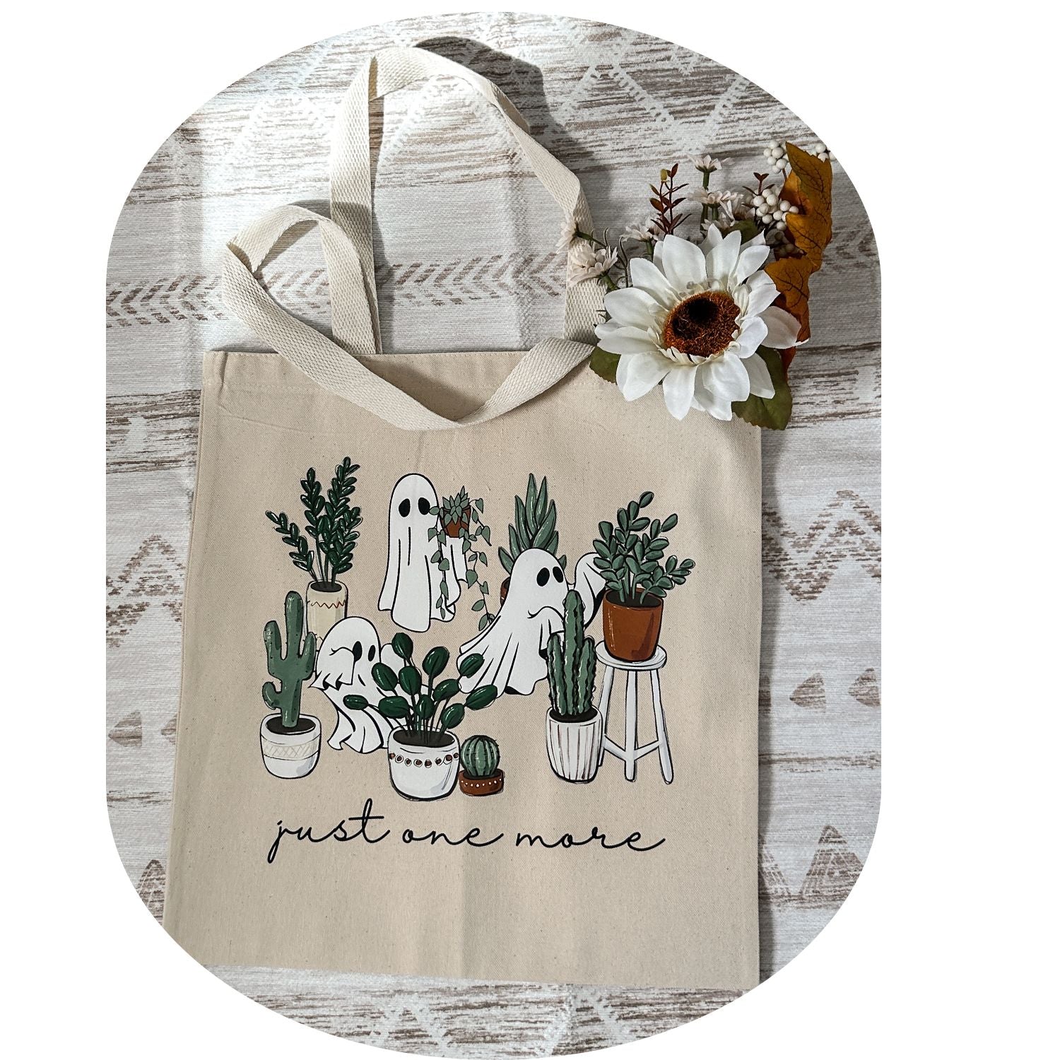A little spooky, a little leafy — this Boo-maniacal Garden Tote is the perfect mix of cozy Halloween charm and plant lover vibes. Featuring adorable ghosts peeking out from hanging plants and cacti, with the phrase “Just one more” at the top, this tote is made for anyone who can’t resist adding just one more plant to their collection.