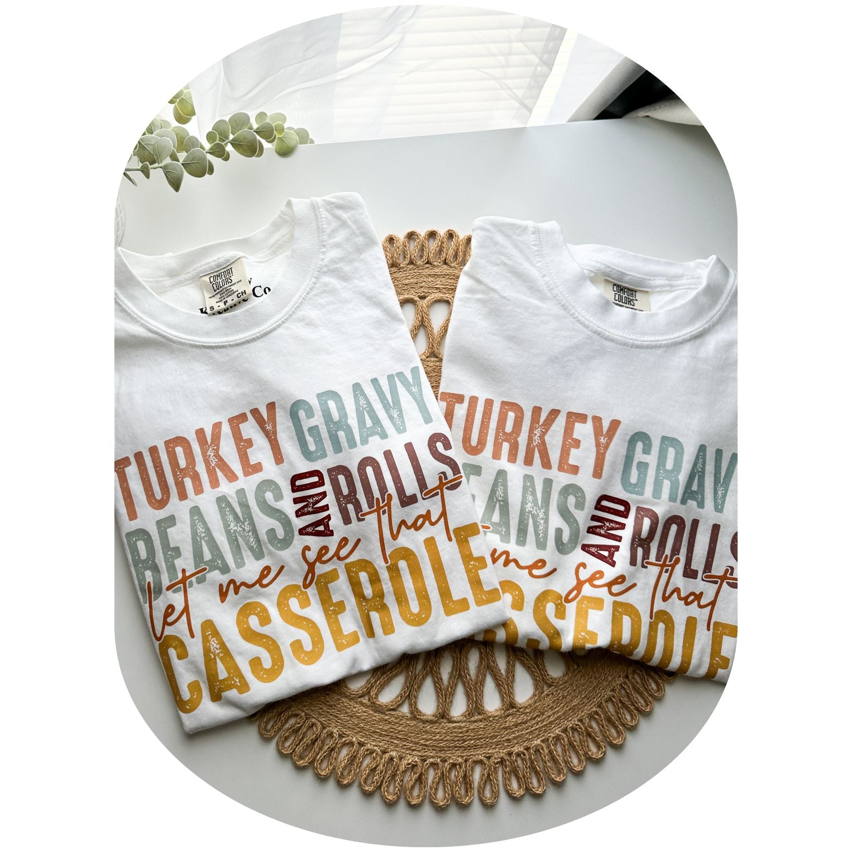 A fun Thanksgiving graphic tee featuring the iconic “Turkey, Gravy, Beans, and Rolls… let me see that casserole!” design. Perfect for turkey day pictures.