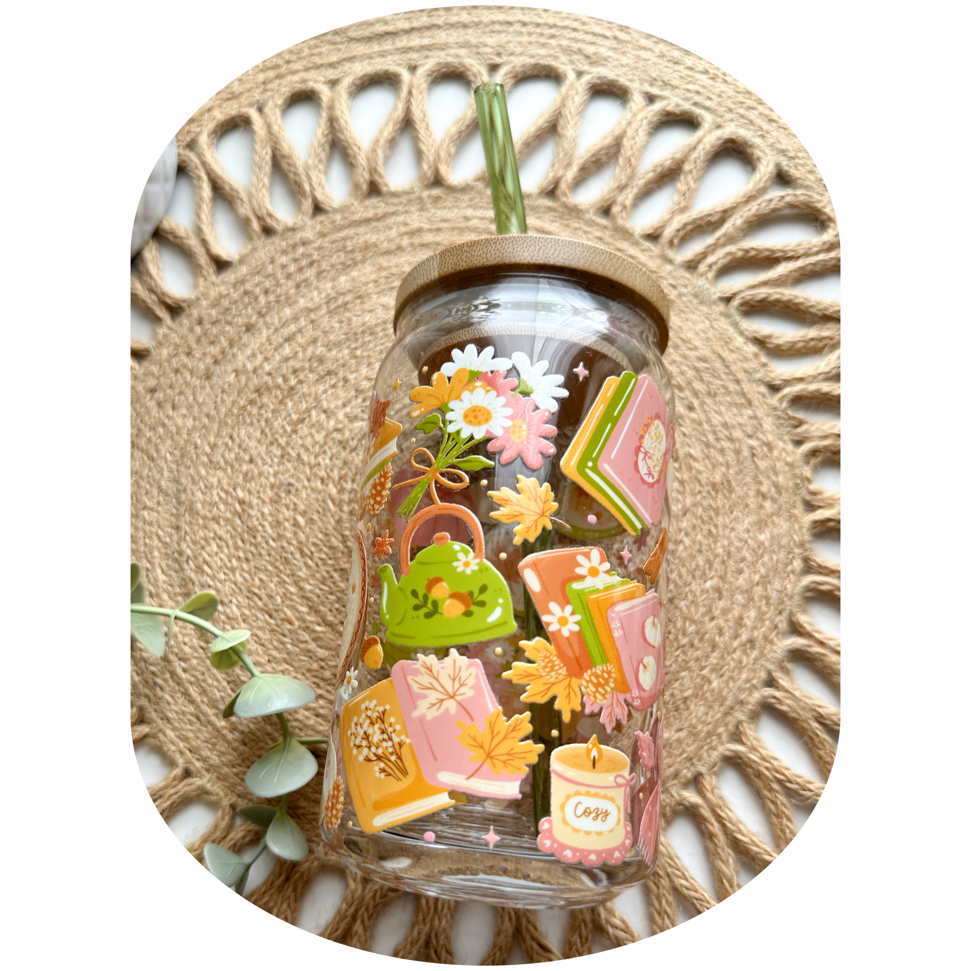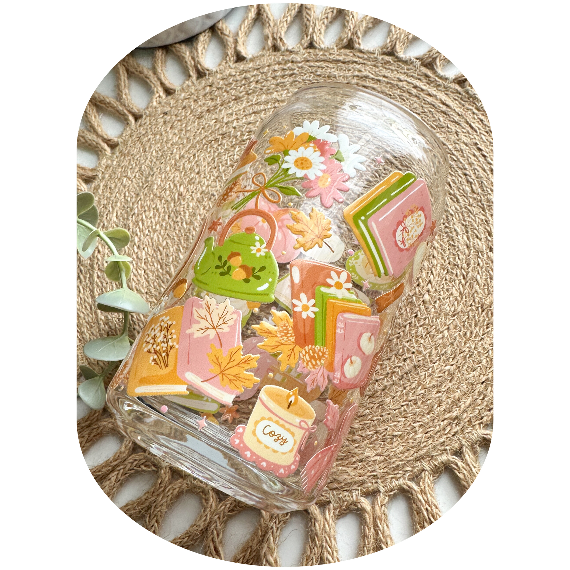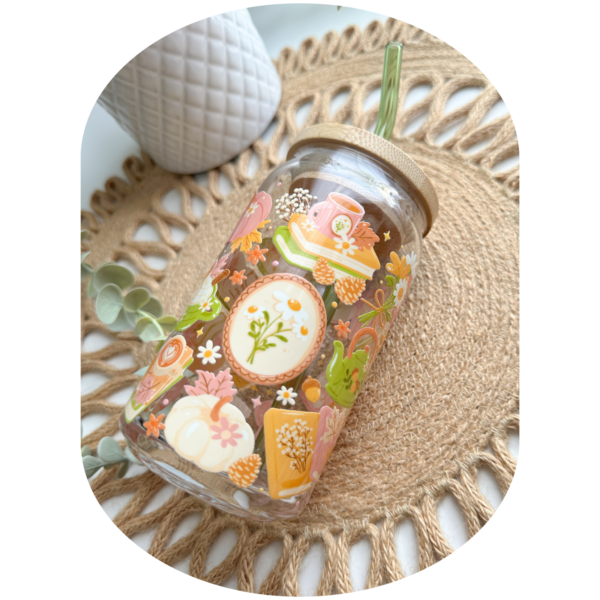 Bring the heart of fall right to your hands with this tea-inspired glass can. Featuring stacked teacups, florals, pumpkins, and a kettle, it’s the perfect design for cozy autumn moments. The double-sided UV DTF design ensures you’ll see its whimsical details inside and out.