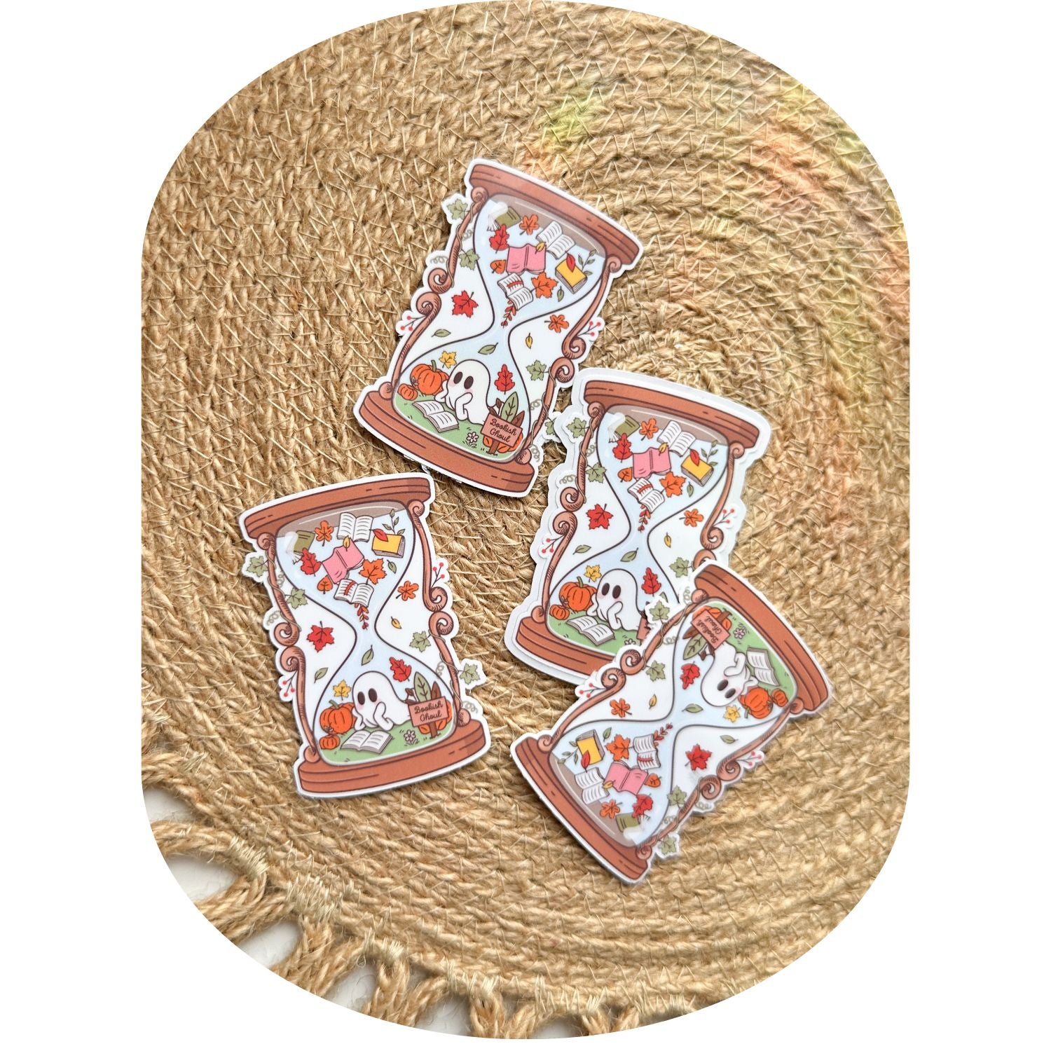 Time stands still when cozy season begins. This hourglass sticker is filled with books, pumpkins, and even a little ghost for a touch of spooky charm.