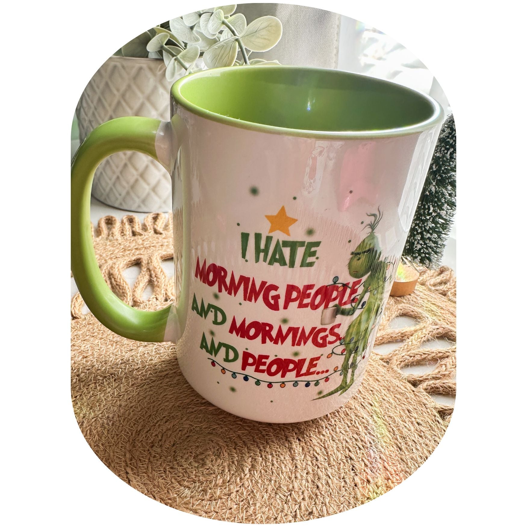 For the not-a-morning-person crew — this funny holiday mug features a green handle and a bold Grinch-inspired design. Perfect for coffee lovers with attitude.