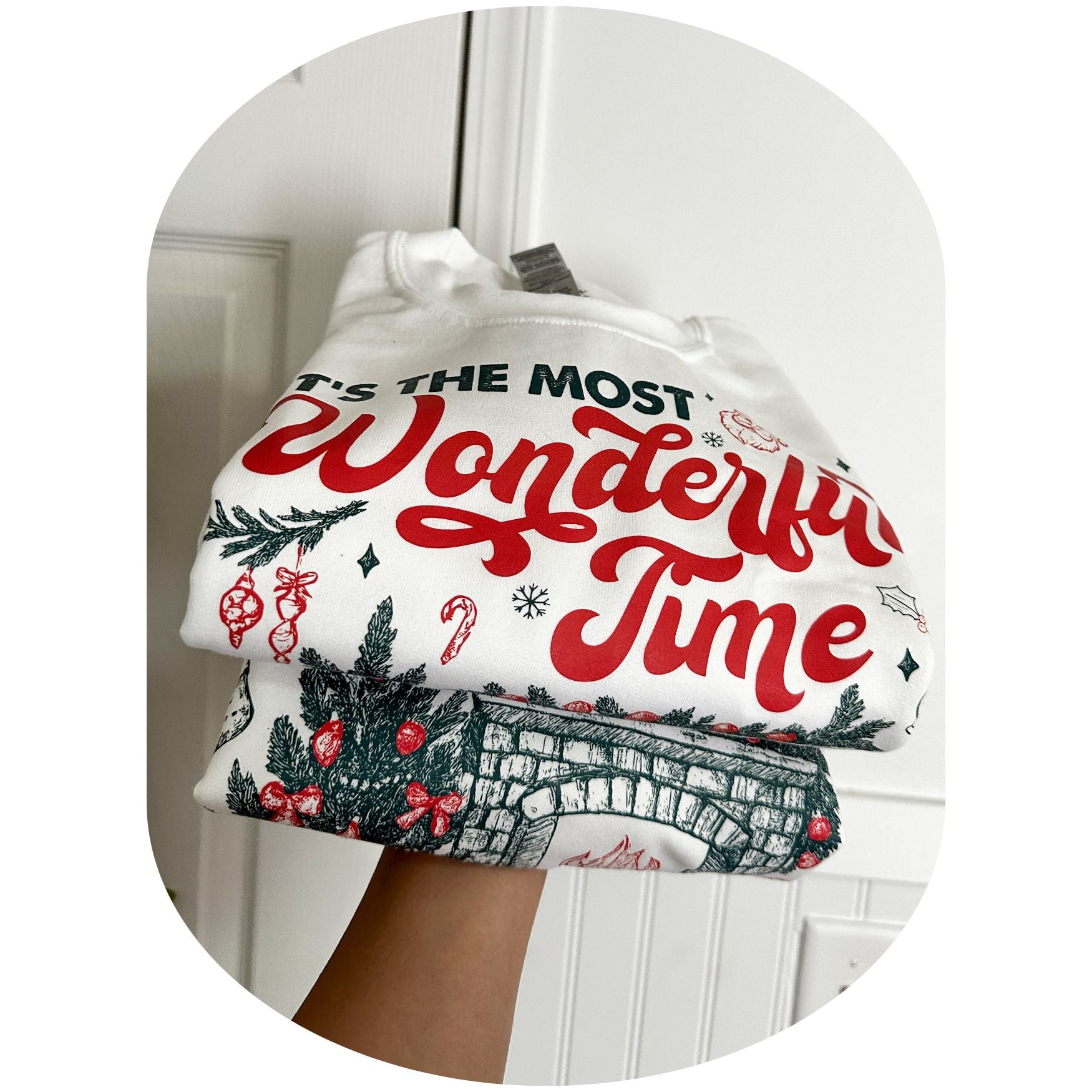Celebrate the season in this classic “Most Wonderful Time” crewneck featuring a cozy fireplace and festive holiday details.