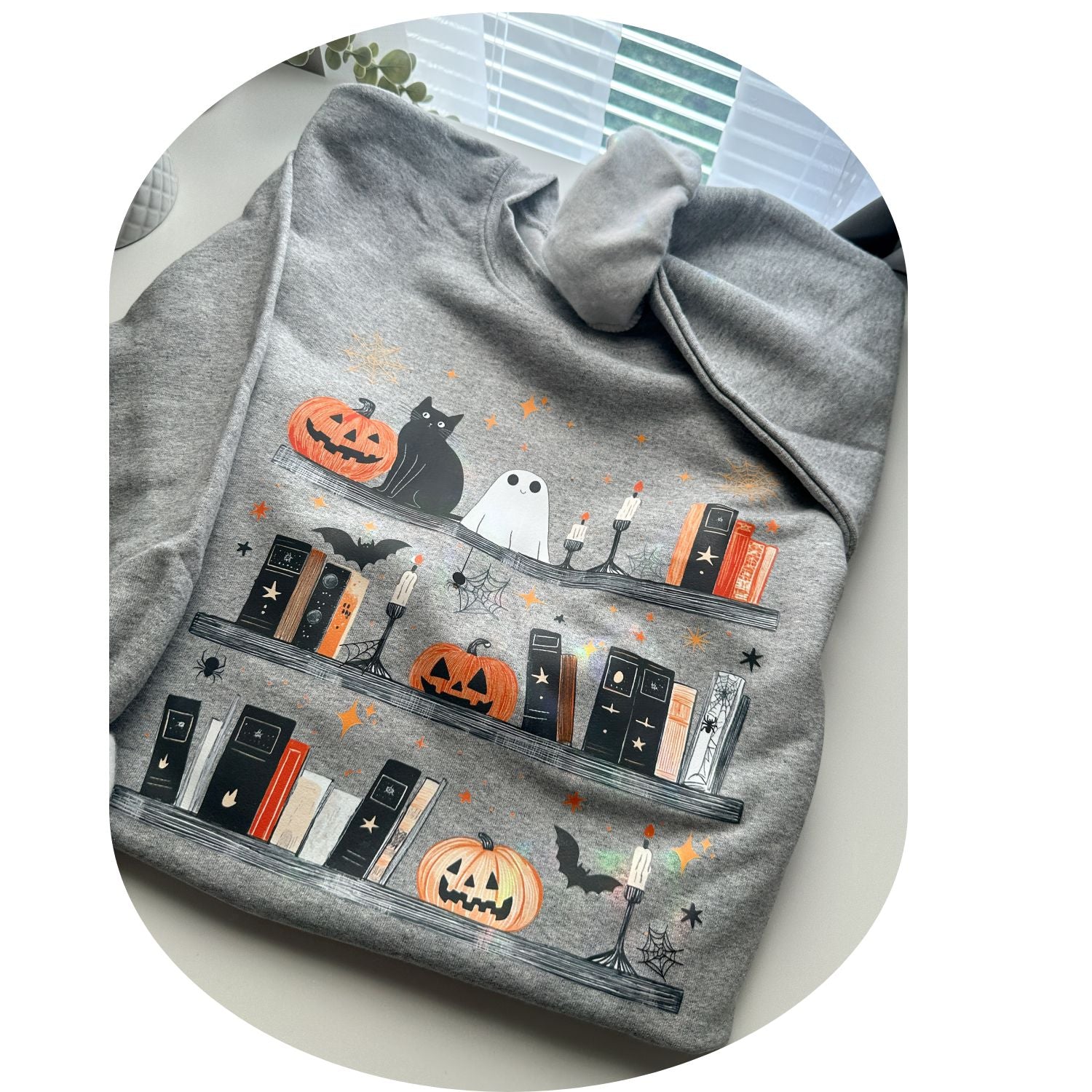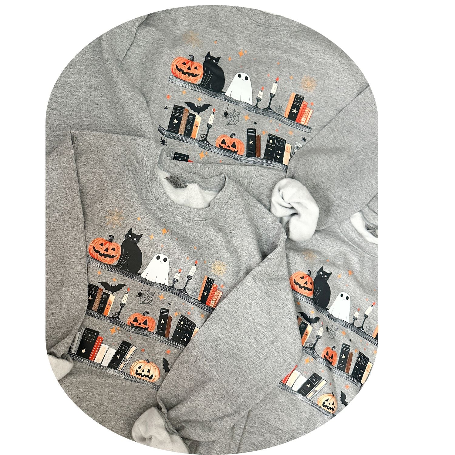 Calling all book lovers — this haunted bookshelf sweatshirt is for you! Decorated with pumpkins, candles, black cats, and ghosts among rows of books, it’s the ultimate cozy + spooky combo. A must-have for readers who love fall nights and haunted vibes.