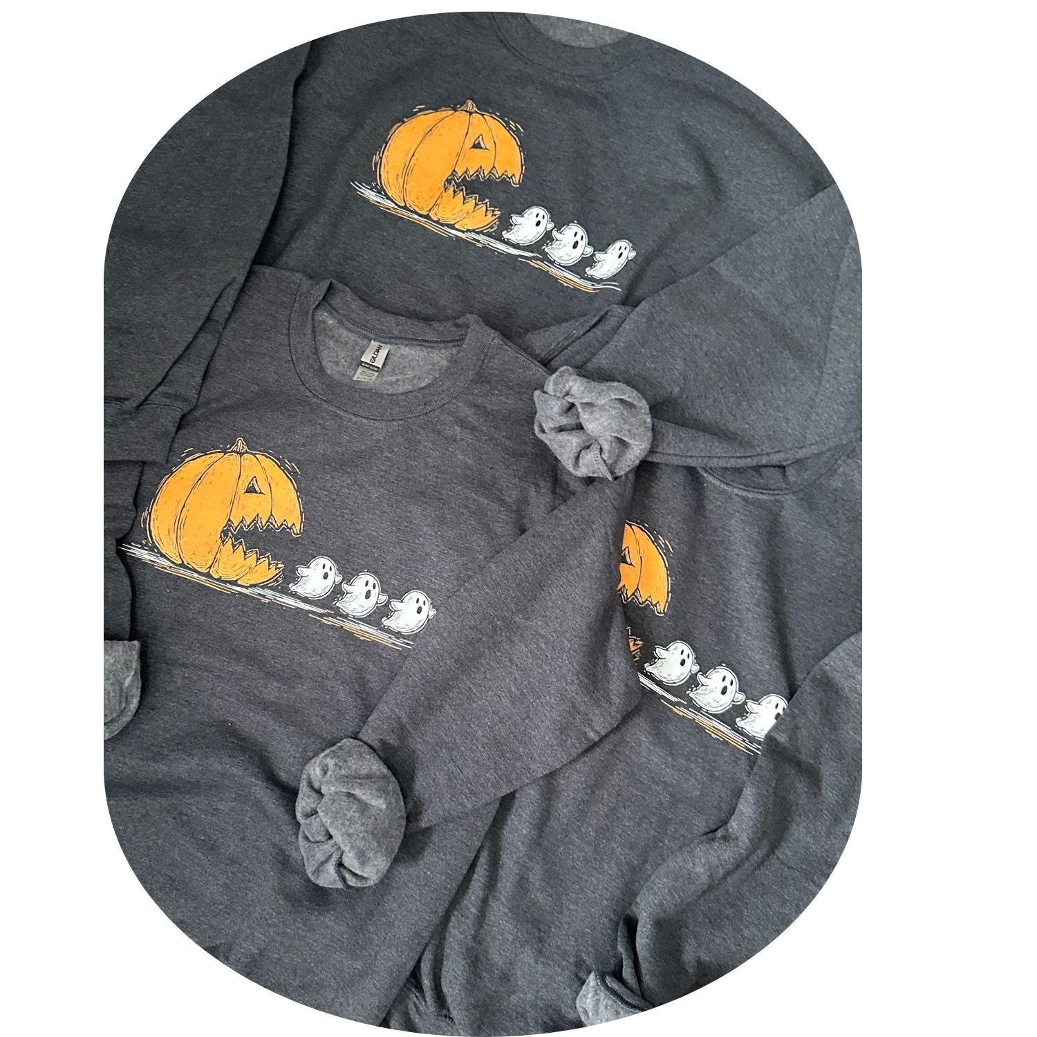 Meet your new fall favorite — the Spooky Pac-Man sweatshirt! Featuring a bold orange jack-o’-lantern “chomping” down a line of little ghosts, this playful design is a fun twist on Halloween nostalgia. Cozy, soft, and perfect for spooky season, it’s made to keep you warm on crisp autumn nights.