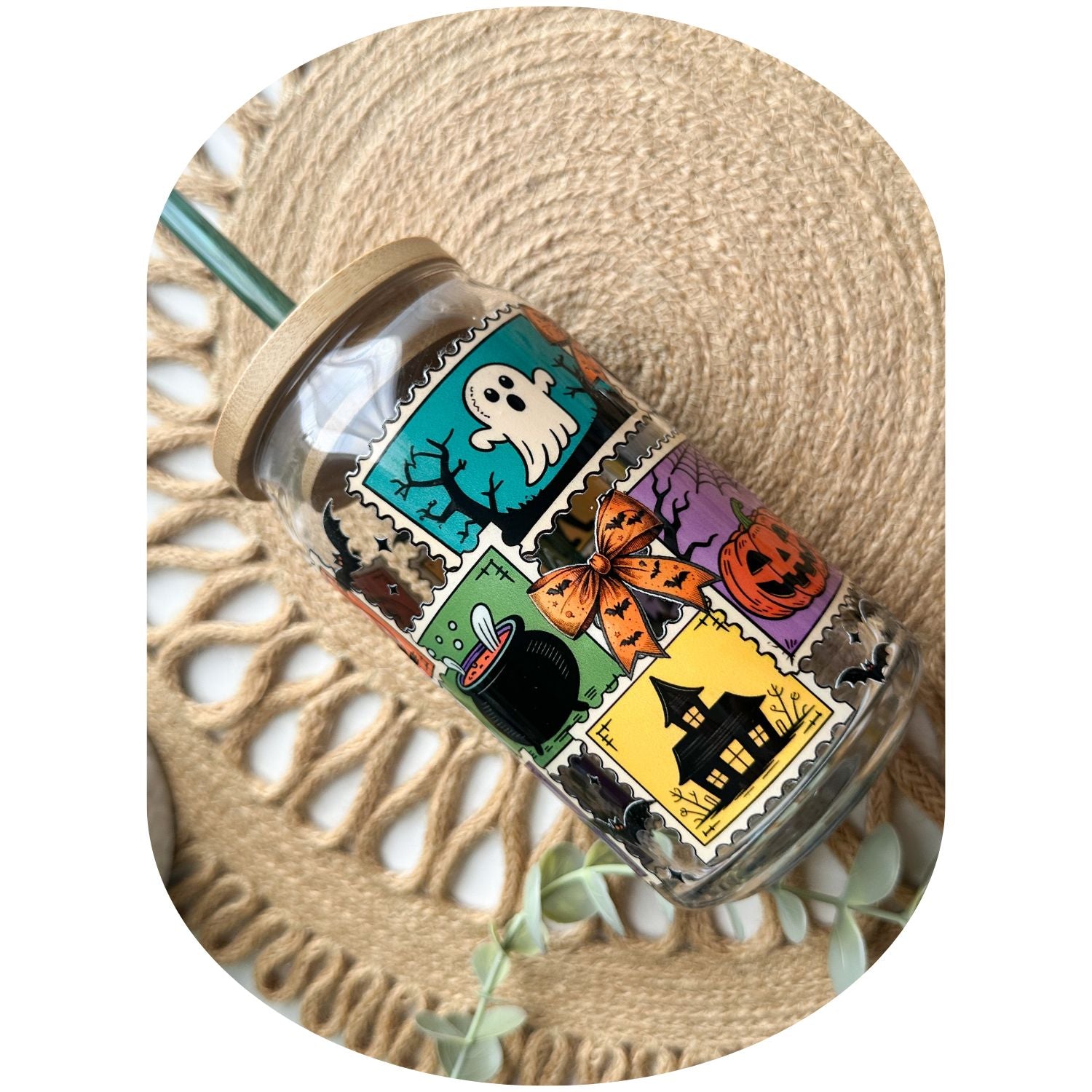 This glass is a Halloween lover’s dream! Decorated with spooky postage stamp designs — ghosts, pumpkins, bats, haunted houses, and cobwebs — every sip feels like happy mail straight from spooky season. The double-sided UV DTF design brings extra charm you can enjoy inside and out.