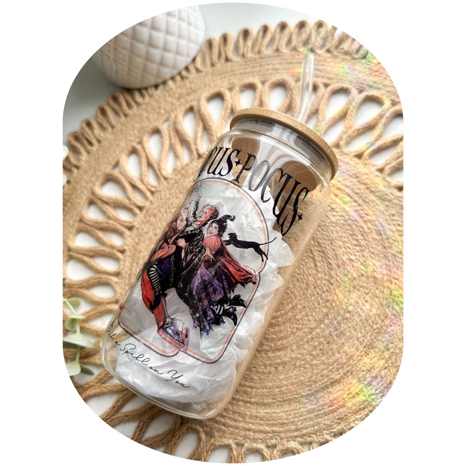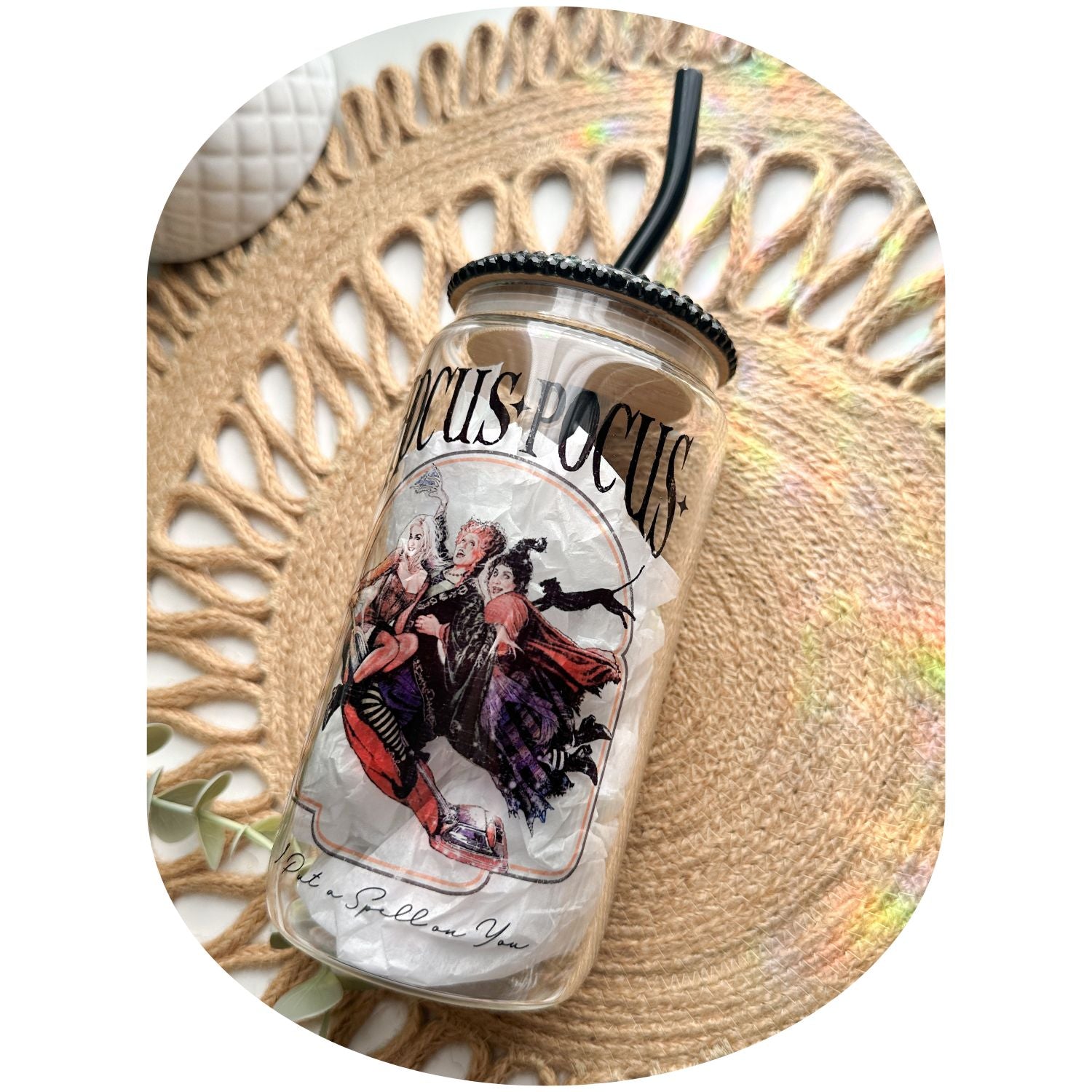 - 1 sublimated glass can cup with bamboo lid + reusable clear glass straw. If you want the black straw, please put it in the notes section before checking out, otherwise you will get the clear straw.(Optional: upgrade your cup with a sparkling rhinestone lid ✨)
